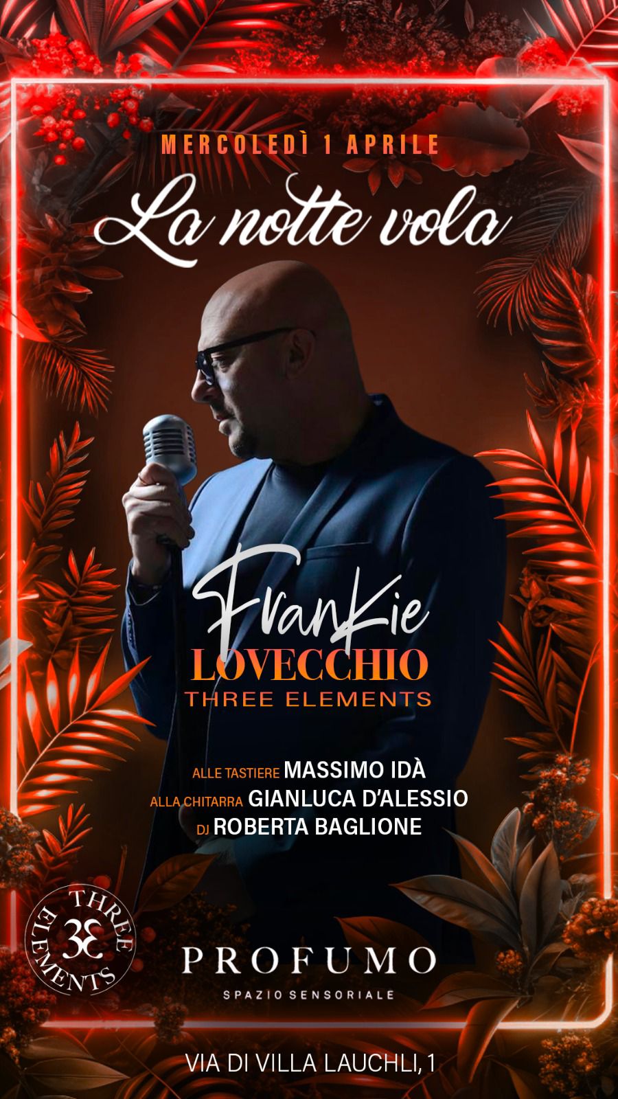 - Frankie Lovecchio & Three Elements: La voce protagonista assoluta sarΓ quella di Frankie Lovecchio. L'impostazione della foto, con il microfono vintage, suggerisce un'esibizione intensa, carismatica e dallo stile molto raffinato.