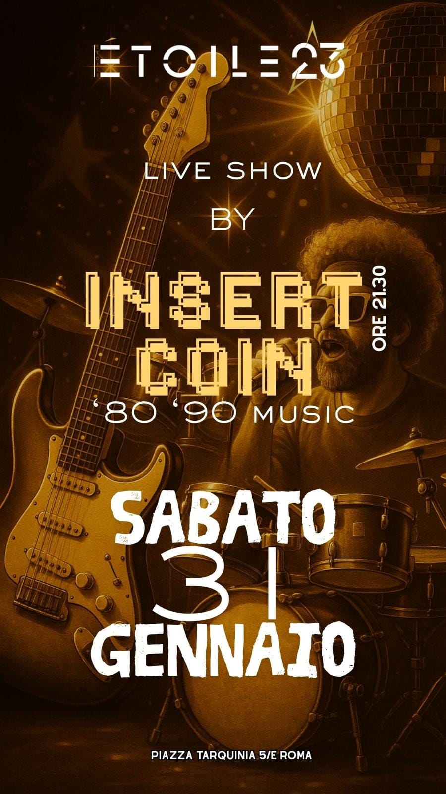 Nella location top in zona Re di Roma con Cena e Discoteca. Ti aspettiamo con il Live Show degli INSERT COIN, la celebre band che con un incredibile e coinvolgente spettacolo vi trasporterà negli anni '80 e '90 con la migliore Dance tutta da ballare, rigorosamente dal vivo.